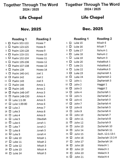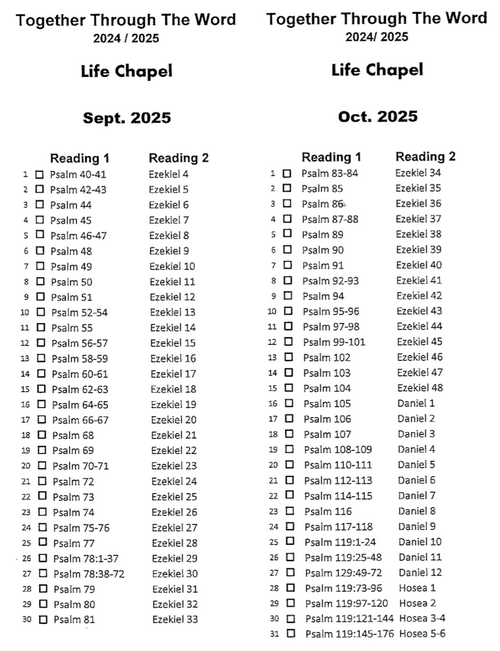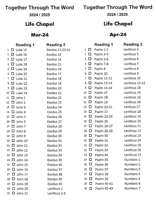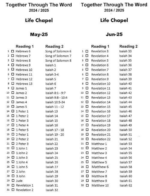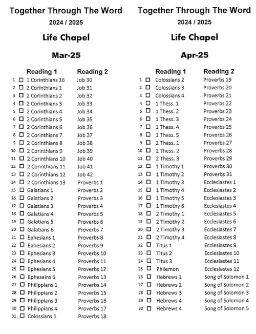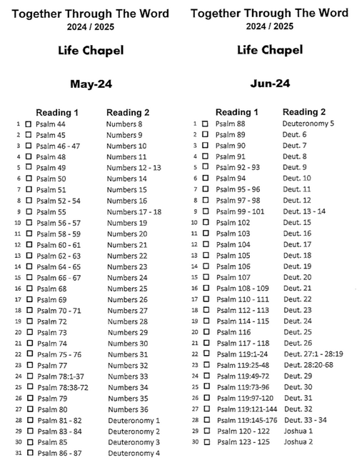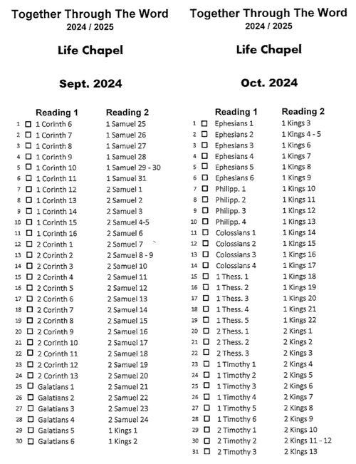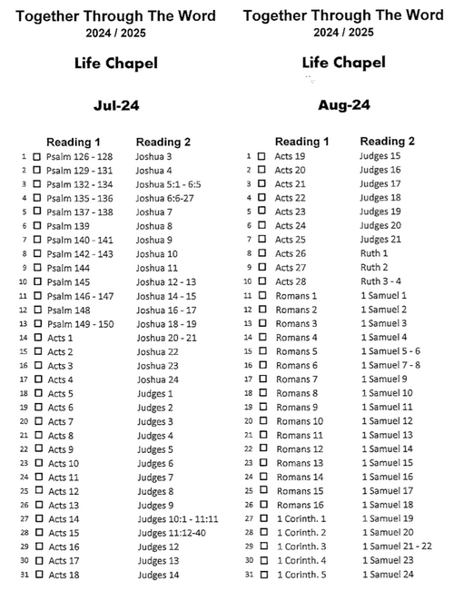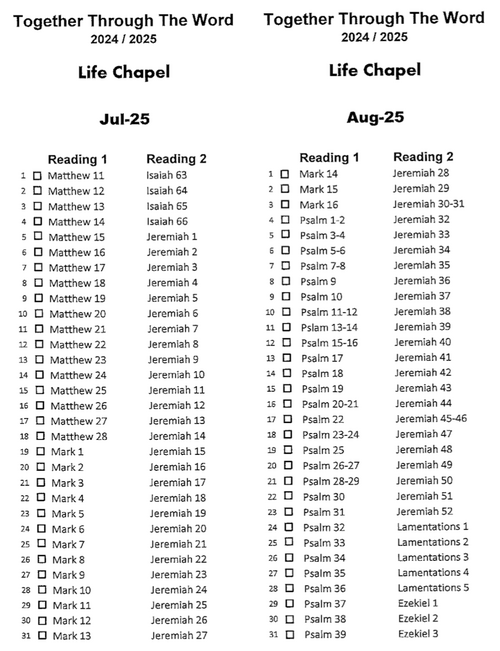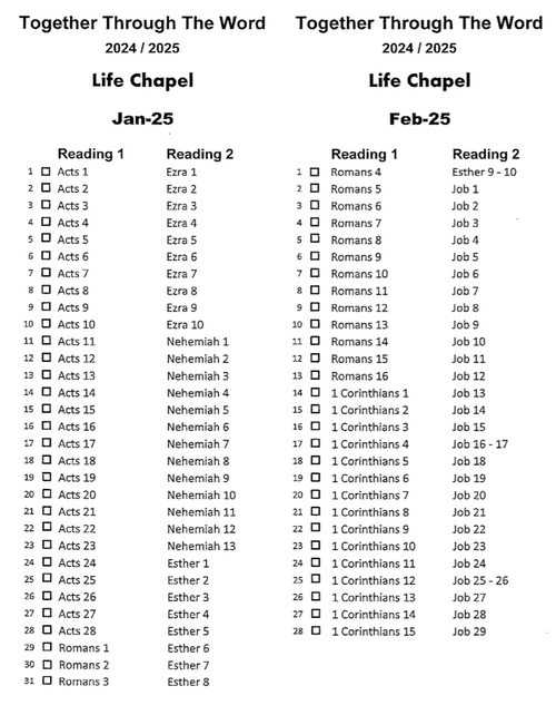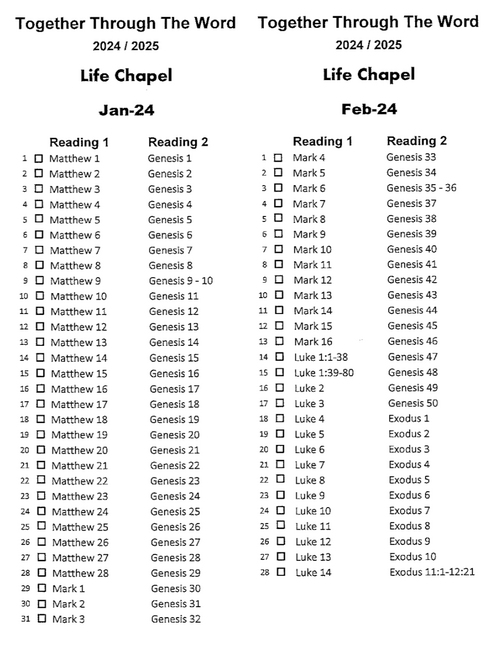Join us in our Bible reading plan! This is a 2-year plan through the Bible for 2024-2025.